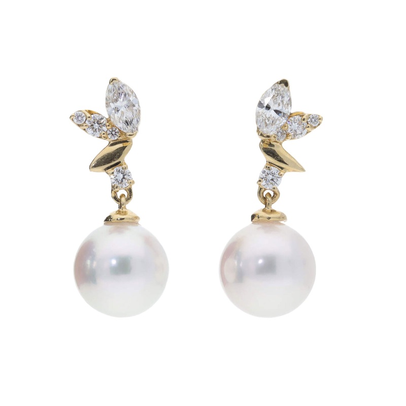 A beautiful pair of dainty drop earrings featuring Akoya pearls and marquise-shaped diamonds (0.30ct), set in 18ct yellow gold. Pearl measures: 7.5mm x 8mm. These exquisite Akoya pearl and diamond petal earrings are a refined choice, marrying the classic b