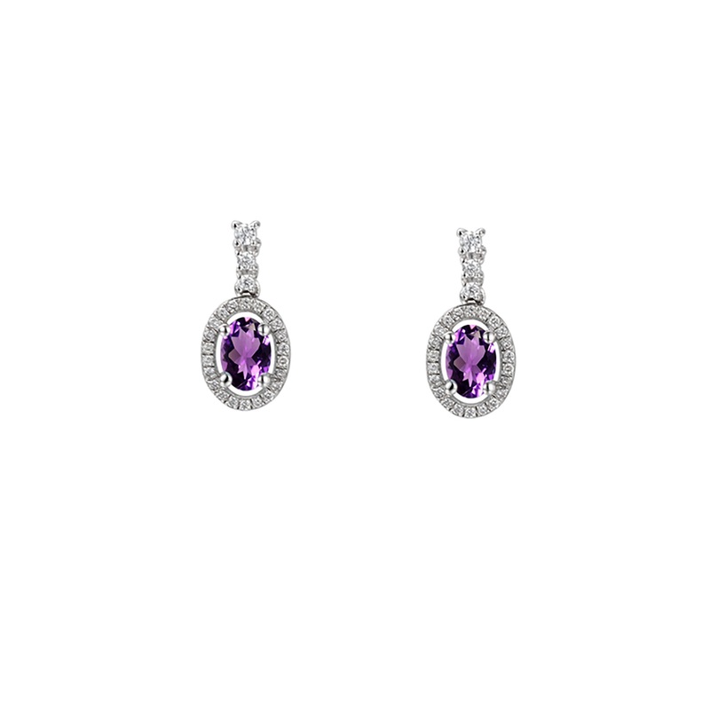 Classic cluster earrings, updated with the Amore modern twist and containing a beautiful genuine amethyst, birthstone for February, surrounded with sparkling cubic zirconia. The deep purple colour of amethyst embraced by stunning zirconia recreates a classic design which looks stunning with any outfit and will brighten up your day.