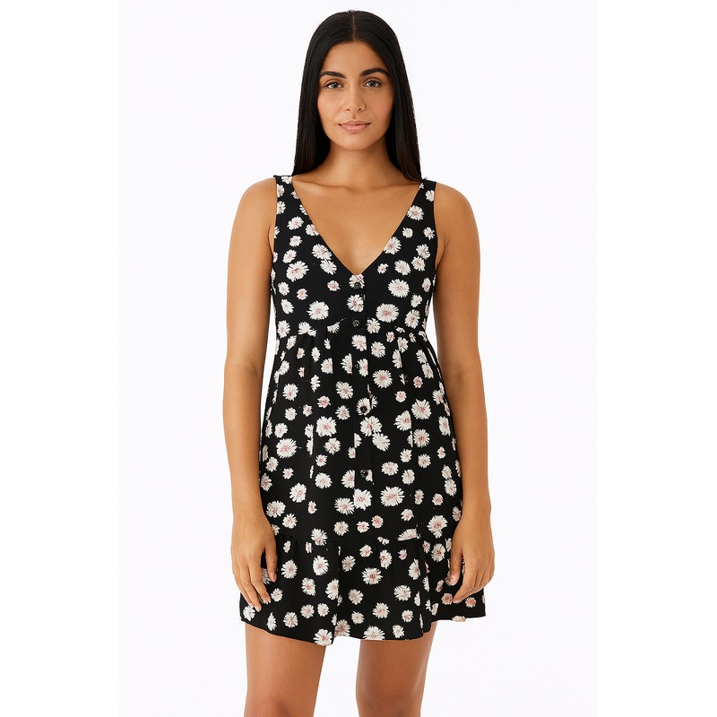 Asos Design Women's Black Dress ANF1875 _Petite Button Through Smock Dress In Black Daisy Print