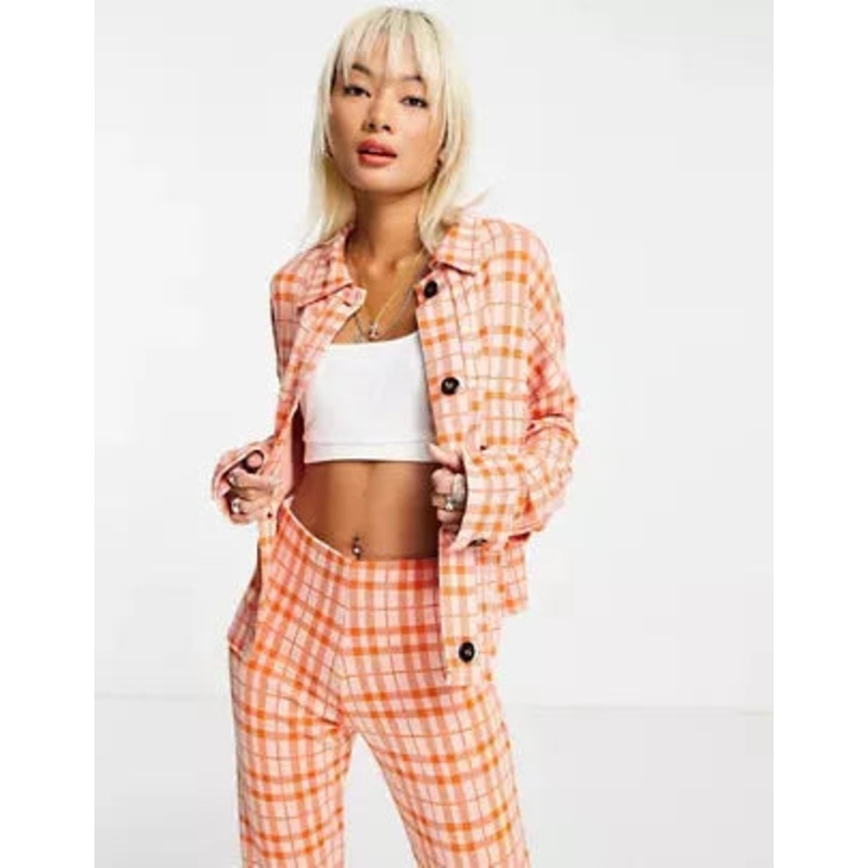 Asos Design Women's Orange Shirt ANF659 Jersey crop suit shacket in orange check