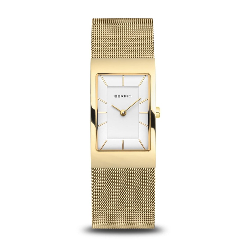 With its rectangular case and clean, minimalist design, this watch brings timeless elegance to the wrist. The polished stainless-steel case with gold-coloured PVD coating adds a luxurious touch and flows seamlessly into the finely crafted gold Milanese strap, secured with a dependable folding clasp.