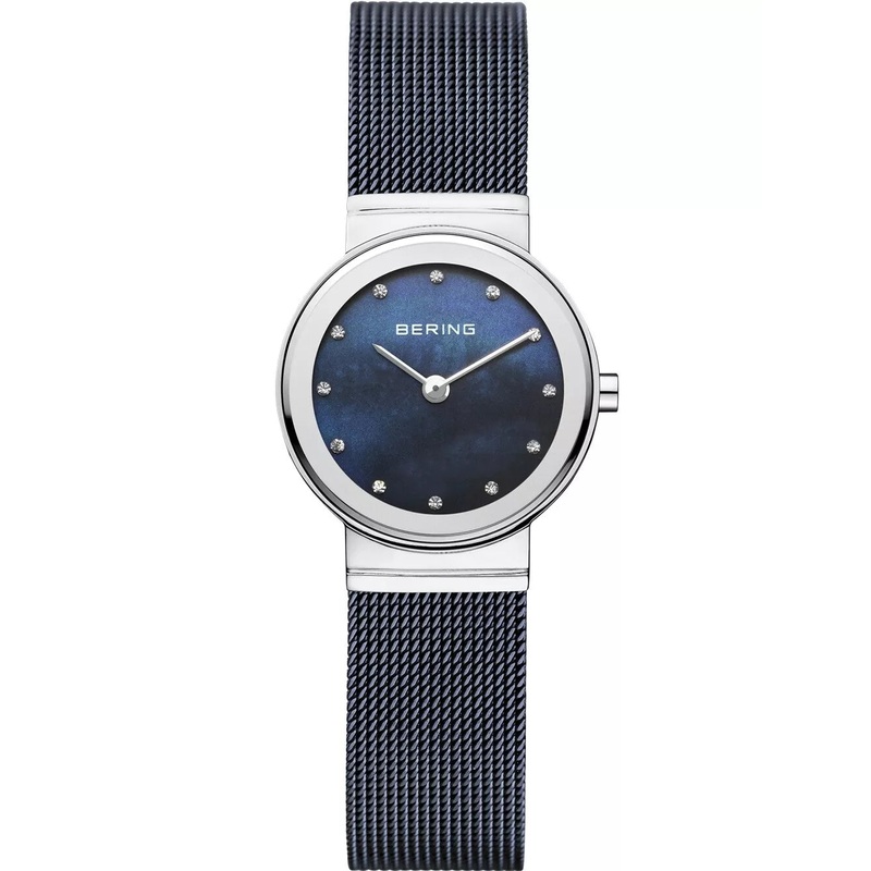Bering Women's Navy Blue Classic Steel Bracelet Watch Sleek & Elegant Design Featuring a deep blue mother-of-pearl dial with crystal hour markers, this watch exudes sophistication and luxury, making it a timeless accessory. Durable & Comfortable Fit The fi