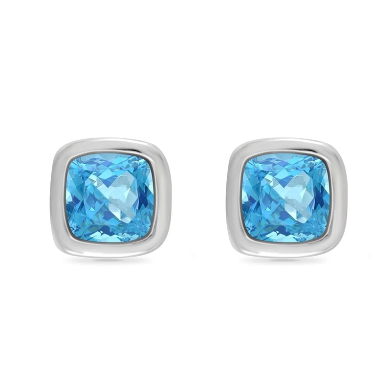 5mm Cushion-shape Blue Topaz gemstones, set in 9ct white gold collar set stud earrings. Post and butterfly fittings.