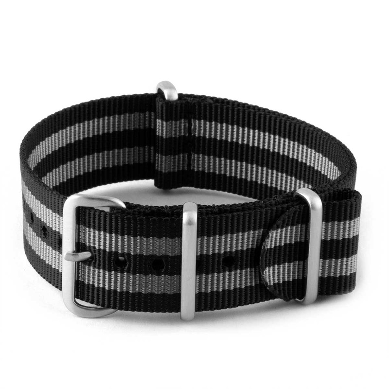 Bracelet-montre Nato - Nylon / Tissus - James Bond "Original" Descriptif : Bracelet pour montre NATO en nylon noir ray gris modle "James Bond". Longueurs : Taille unique 270mm pour tour de poignet compris entre 14 et 24cm, pour tailles XS, S, M, L, XL. Lar