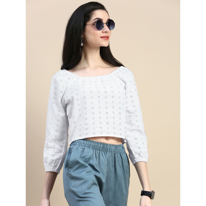 De Moza Women Sciffly Top Woven Top Embroidery Cotton White Pattern: Schiffli Color:White Fit: Regular Fit Sleeve: 3/4th Sleeve Length: Short Product Material:Cotton These style elements includes a regular fitembroidery cottoncrop top with 3/4th sleeve, so