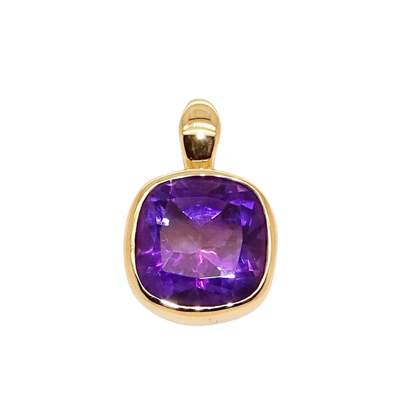 Unique pendant with a 7mm cushion shape amethyst in a collar stting, 9ct yellow gold. Chain not included.