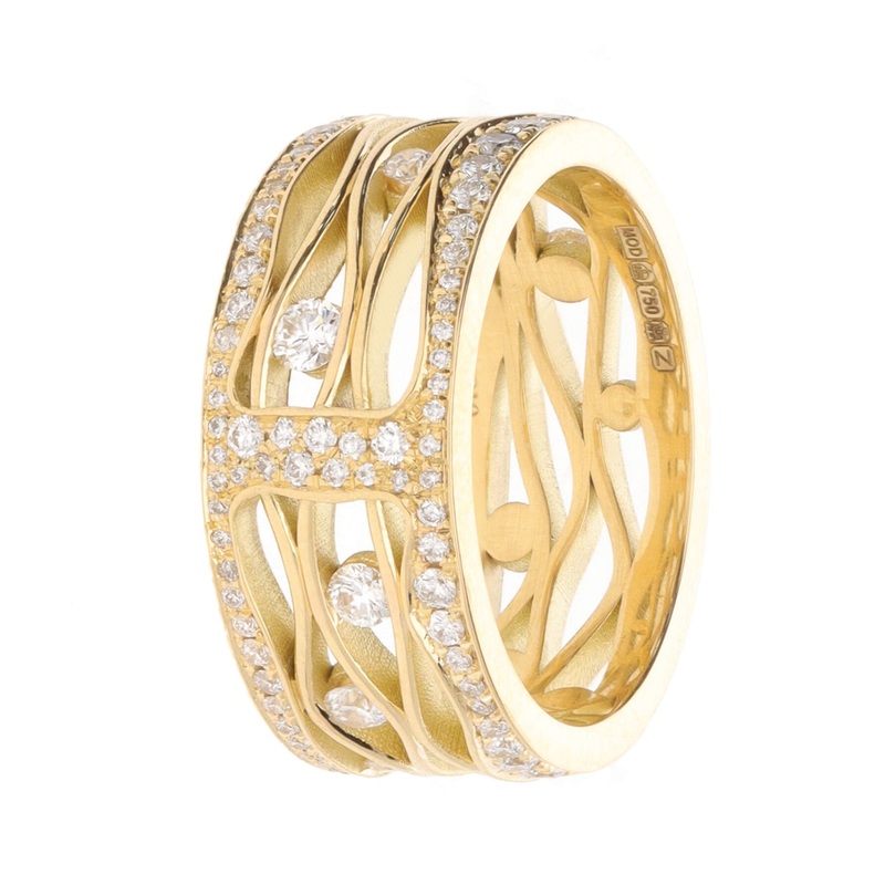 A beautiful diamond set 18ct yellow gold ring with a wave design. Set with 0.30ct of diamonds within the waves plus 0.51cts in the border.