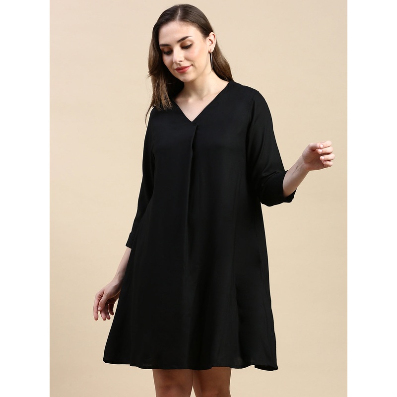 De Moza Women'sDress Black Pattern:Solid Color:Black Fit: Regular Fit Sleeve: 3/4th Sleeve Length: Short Style: Casual Wear Product Material:Rayon These style elements includes a regular fit with 3/4th sleeve dressso stylish yet comfortable and easy mainte