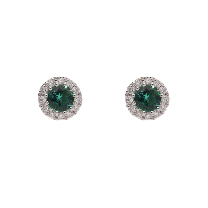 Beautiful pair of stud earrings featuring round emeralds (0.30ct) with a diamond surround (0.12ct), set in 18ct white gold.