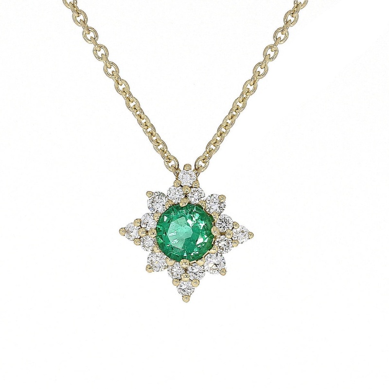 This stunning pendant features a vibrant 0.28ct emerald at the centre, surrounded by a dazzling cluster of diamonds totaling 0.19ct. The unique "Guiding Star" design creates a captivating sparkle, with the emerald and diamonds radiating outwards, symbolisi