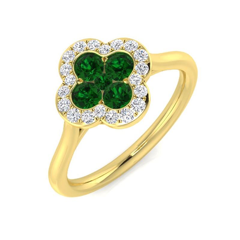 This stunning ring is crafted in 18ct yellow gold and features a clover-shaped design, set with five vibrant emeralds totalling 0.32 carats. Surrounding the emeralds is a sparkling diamond-set halo, with a total diamond weight of 0.14 carats, adding brilli