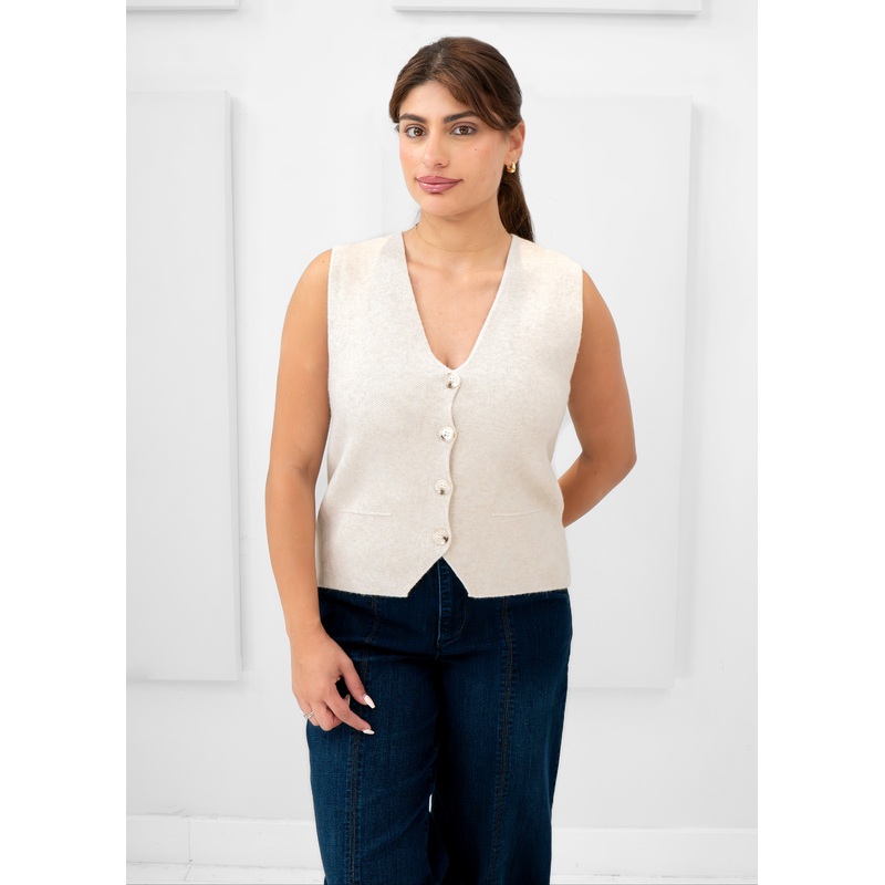The Eternelle Knit Vest combines softness with a classic button-front design, making it ideal for layering with comfort and style. Button front Flat shoulder to hem measurement: approx. 21 Delicate wash, hang to dry, may snag on jewelry 70% Viscose, 25% Mo