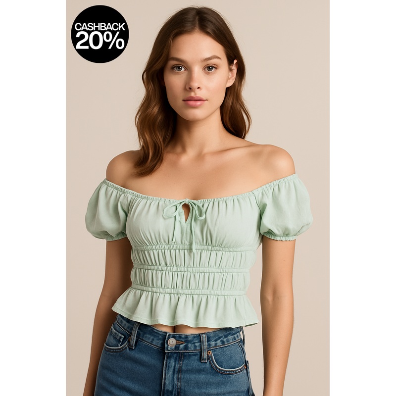 Forever 21 Women's Mint Green Off Shoulder Crop Top Romantic and feminine, this Forever 21 crop top features airy puff sleeves, a smocked bodice for a flattering fit, and a ruffled hem. The soft mint green shade adds a fresh, spring-ready touch. Wear it of