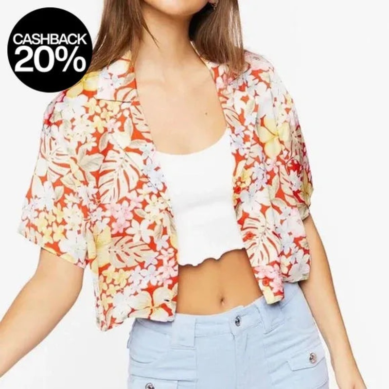 Forever 21 Women's Red Floral Short Sleeve Shirt Women's Hawaiian Crop Top Aloha Shirt in Hibiscus. 100% Rayon Soft and Flowy Perfect for Luau Party and Hawaii Theme Party Comfortable fitting One front pocket Button down closure Short sleeves 15 length Col