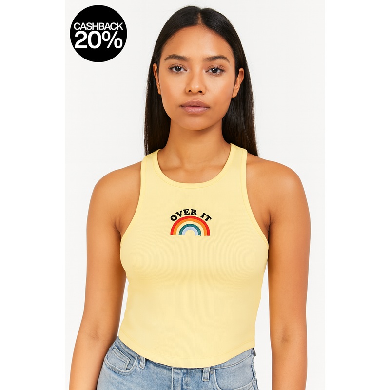 Forever 21 Women's Yellow Ribbed "Over It" Graphic Tank Crop Top This trendy Forever 21 tank top is a ribbed knit in a cheerful light yellow color. The front of the top features a small, embroidered rainbow with the text "OVER IT" stitched above it, adding