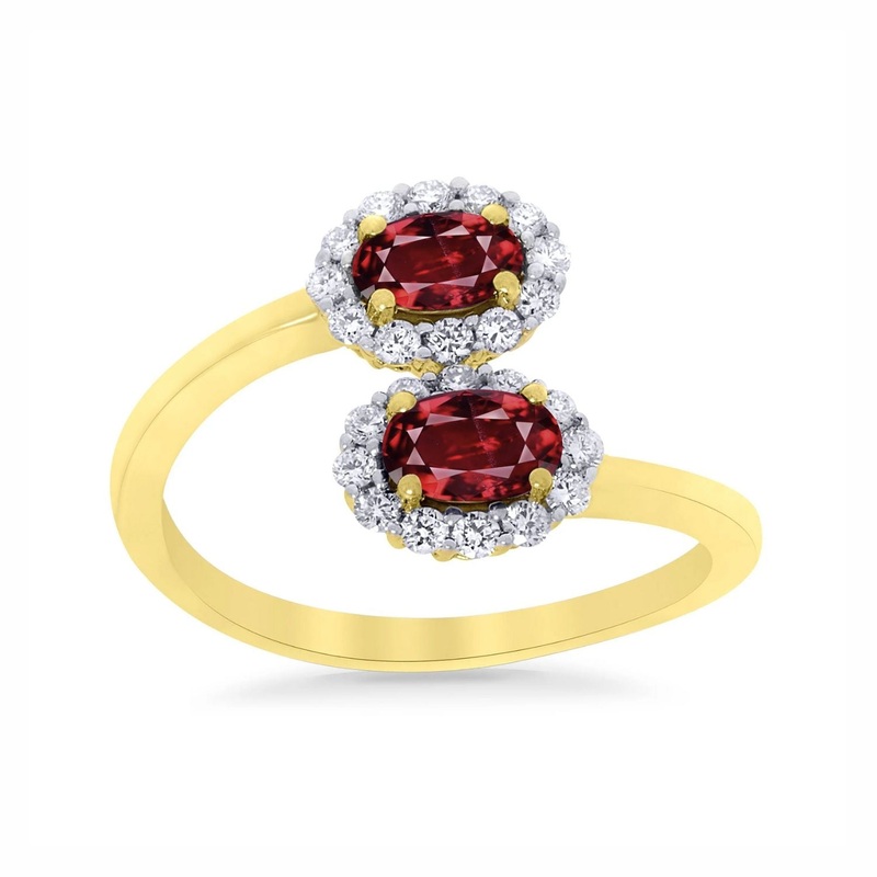 Modern twist on a classic toi et moi style ring. Two 5x3mm oval garnets are set with a diamond halo on a 9ct yellow gold crossover style ring. Total diamond weight 0.14ct