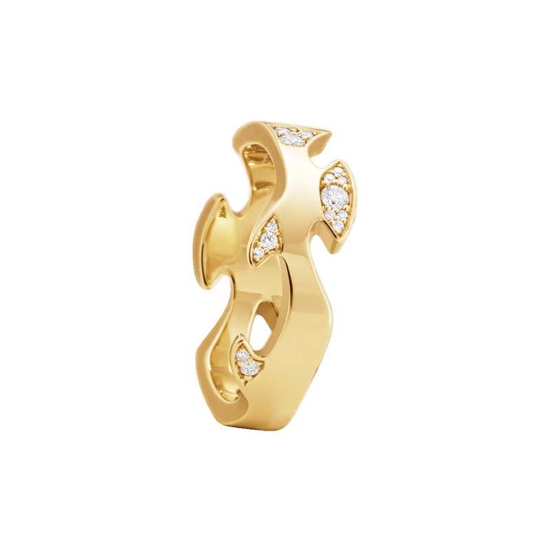 The iconic Fusion collection was first envisioned by Danish designer Nina Koppel. This organically-shaped ring is crafted from 18 carat gold and finished with shimmering bursts of pav-set diamonds. It makes a striking standalone piece or can be slotted tog