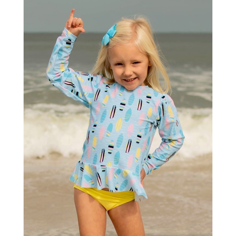 This adorable two piece girl's swim set features a long sleeve, unlined ruffle sun shirt made of soft, stretchy UPF 50+ sun protective fabric in a fun surfboard print, with coordinating pale yellow lined swim bottoms. Proudly made with care in the USA!