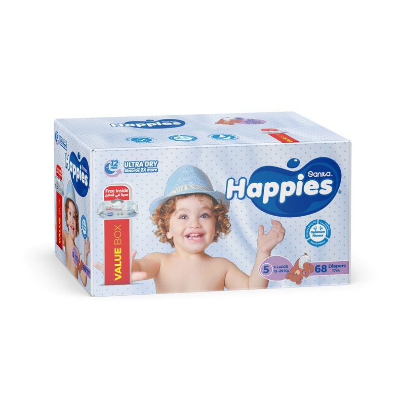 Happies Value Box Diapers Size5 ( 12-20kg) 68 Diapers + Wet Wipes Free Inside From 12 to 20 Kg 12 hours of dryness. Dermatologically tested. Optimum fitness. Size Up indicator. Cushiony breathable system. Stretchy waistband and body fit (2 x more Flexible)