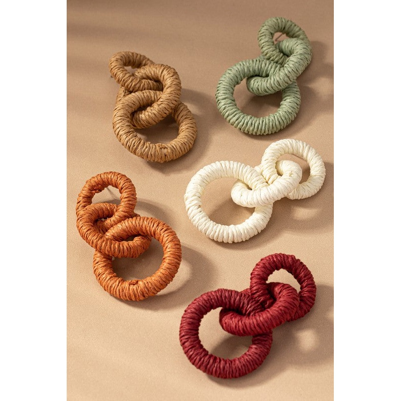 Get wrapped up in these playful hemp rope-wrapped chunky wood hoop earrings, perfect for your fall or autumn look! The wood hoops are linked by 3 chunky pieces, all wrapped in cozy hemp rope. A very unique look!