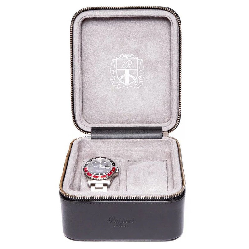 The ultimate gift for the modern gentleman - the Hyde Park two watch case is covered in a buttery black, grey, tan or navy leather, with a robust zip too close. A smooth suede lines the inside watch compartments, with adjustable watch cushions. Our emblem