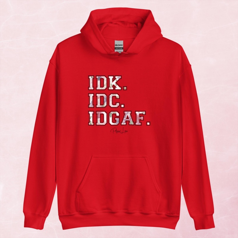 IDK.IDC.IDGAF. Graphic Hoodie|Red|Heliconia|Irish Green|Orange|Military Green|Carolina Blue|Gold|Sand|Light Pink|Ash|White|S|M|L|XL|2XL|3XL|4XL|5XL