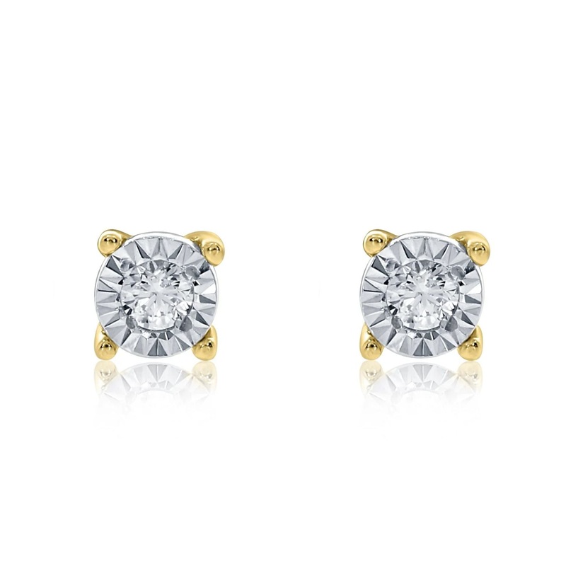 Diamond solitaire earrings in 9ct yellow gold. The round cut diamonds are set with a faceted white gold surround to give the illusion of larger diamonds. Classic earrings with a post and butterfly fitting. Total diamond weight 0.05ct