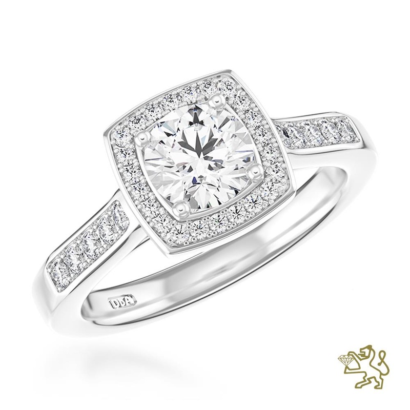The halo of diamonds enhances the size of the certificated centre diamond, creating a truely mesmerising ring.
