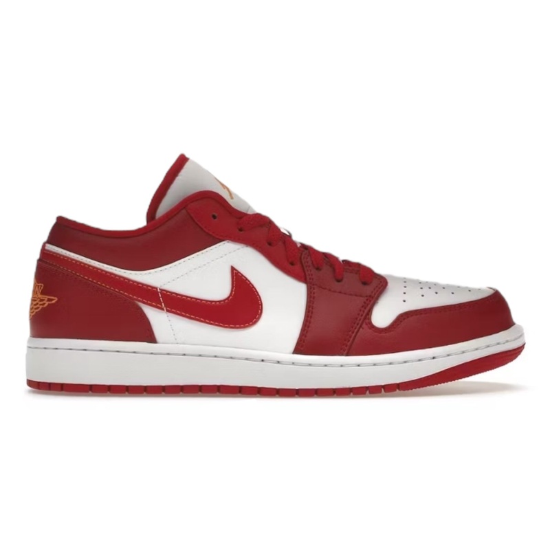 The Air Jordan 1 Low Cardinal Red has red laces that lay on top of a white tongue. The shoes logo can be found at the top of the tongue in red. On this model, you will find a red sole paired with a white midsole. The body of the shoe is made out of…