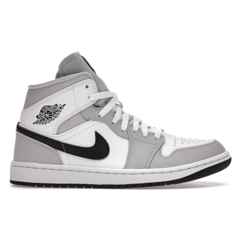 Condition: Brand new. The women's Jordan 1 Mid Light Smoke Grey (W) features white leather upper with Light Smoke Grey overlays and black Swooshes. From there, a classic Jordan Wings logo on the collar and Jumpman logo tongue label add the finishing touch.
