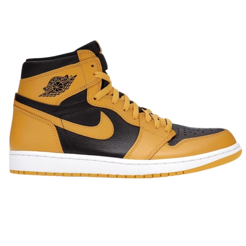 Condition: Worn Condition. In a simple two-tone format, the upper of the Air Jordan 1 High Pollen is constructed of black tumbled leather with Pollen Yellow overlays and Swooshes. Matching woven tongue tags and a Jordan Wings logo on the collar add authent