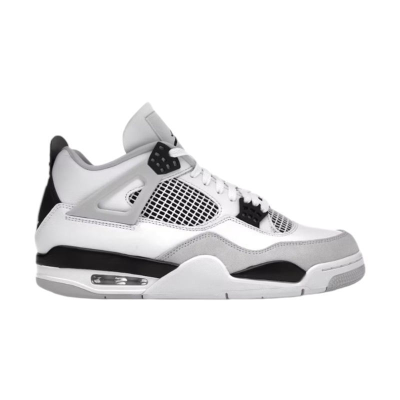 Condition: Used, worn condition. Heel drag shown in photos. Pulling its color-blocked style from the Air Jordan 4 Military Blue, the Air Jordan 4 Military Black features a smooth white leather upper with a light grey Durabuck toe wrap and netted TPU insert