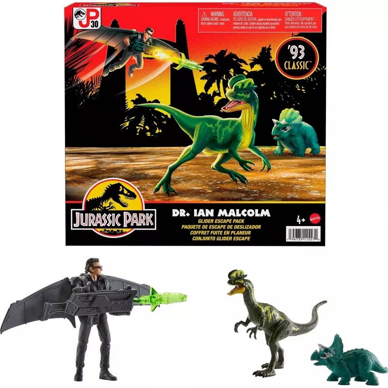 Jurassic Park Dr. Ian Malcolm Glider Escape Pack The '90s come roaring back with the Jurassic Park '93 Classic Dr. Ian Malcolm Glider Escape Pack! Launch the projectile with button activation and attach the wing-pack glider to the Dr. Ian Malcolm 3.75 in-s