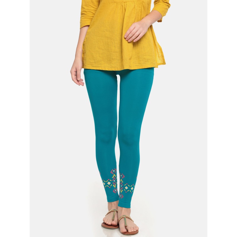De Moza Ladies Viscose Ankle Length Placement print Legging Teal 95% Viscose 5% Elastane Hand Wash | Don't Bleach | Dry in Shade | Mild Iron