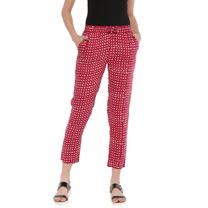 Style & Fit :De Moza Ladies Woven Bottom Straight Pant Printed Rayon RedFabric Specification:Fabric : RayonMaterial : 100% RayonWash Care : Mild Wash | Don't Bleach | Dry in Shade | Mild IronHSN Code : 62046990