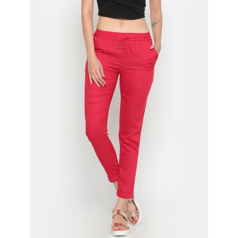 De Moza Ladies Straight Pant RedPattern: SolidColor: RedFit: RegularRise: MidLength: AnkleStyle: Casual WearProduct Material:Rayon The featured elements includeelastics and pull on closure. This style has side and slit pockets, ankle length yet comfortable