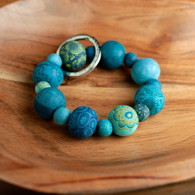 Got your hands full? This clever design allows you to express your style while keeping your keys accessible and your hands free! Handcrafted 10mm and 18mm polymer clay beads Lead-free, nickel-free and cadmium-free Ultra-durable 1.8mm elastic cord Silver ke