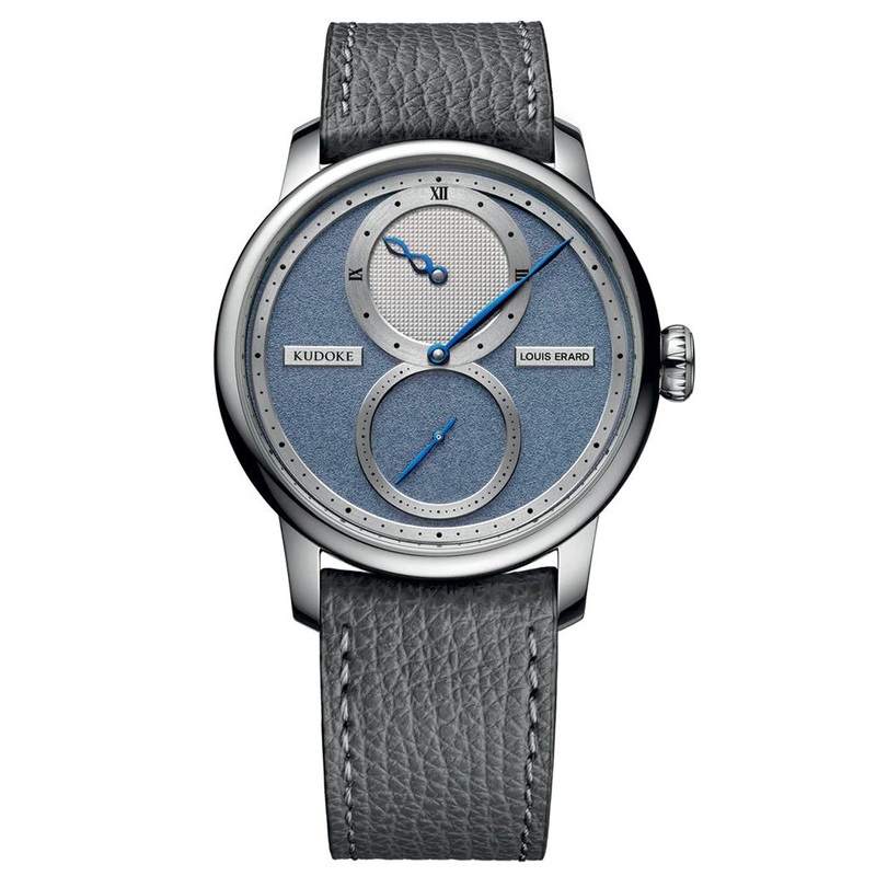 Framed by a 42 mm polished stainless steel case, the dial features KUDOKEs distinctive watchface elements. The railway-track chapter ring, two counter rings as well as the LOUIS ERARD and KUDOKE nameplates are satin-finished and rhodium-plated. The 12 oclock counter is adorned with a Clous de Paris hobnail pattern, a ring bearing Roman numerals counter and the iconic infinity-shaped hours hand, while all hands are in blued steel. The lower part of the dial has a grained finish for a frosted effect and comes in three different colors: purple (limited to 78), forest green (100), light blue (100); while the fourth variation is a collector alert with its white mother-of-pearl dial (78).