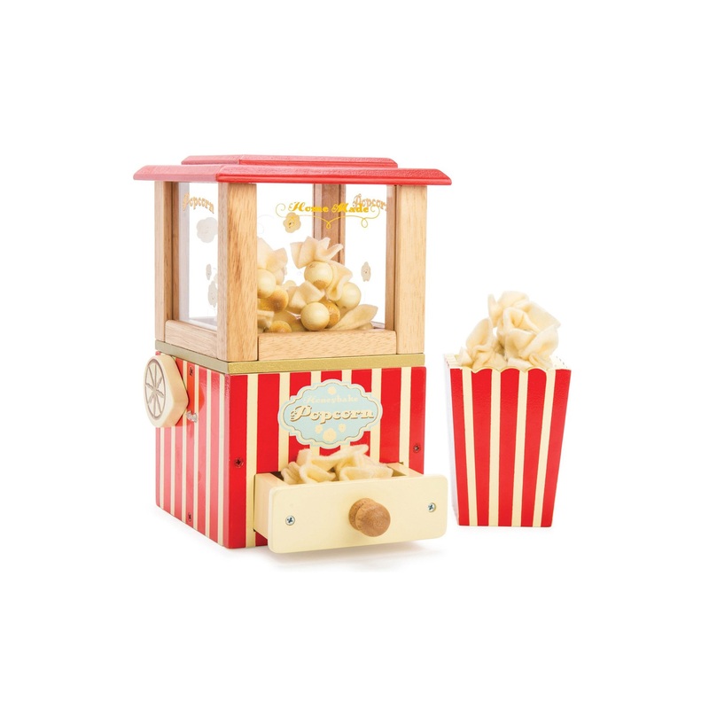 Let's pop imaginary popcorn to snack on while watching tv or recreating a circus or theater production with this wood and fabric popcorn. Hold down the"pop handle and release to watch the kernels pop! Complete with 5 felt play popcorns to collect from the