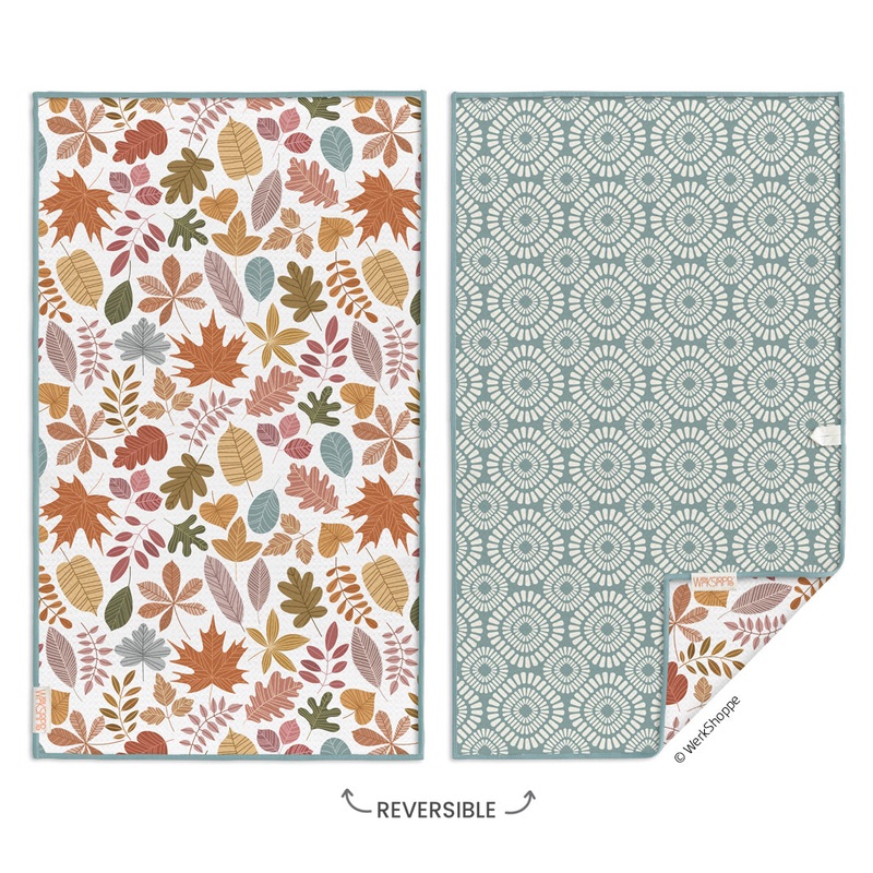 This reversible microfiber kitchen towel showcases a variety of autumn leaves on one side, and a coordinating pattern on the other. A versatile and stylish complement to seasonal decor.