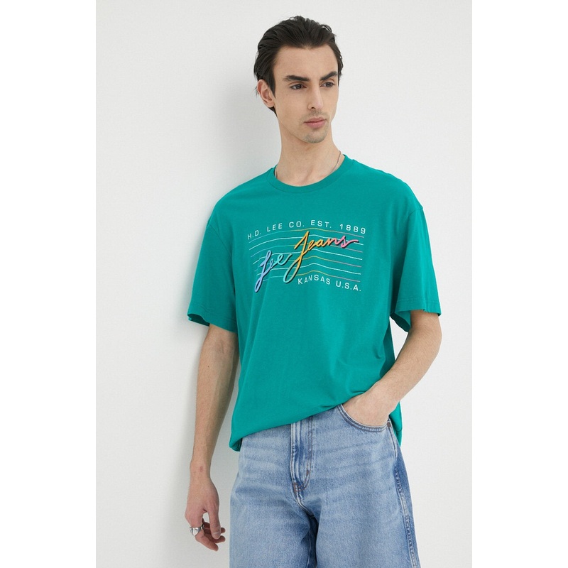 Lee Men's Green Cotton Short Sleeveless T-Shirt Lightweight T-shirt from the Lee collection. Made of fine, stretchy knit. Comfortable cotton fabric. - Relaxed fit.- Crew neck.- Dropped shoulders.- Printed pattern.