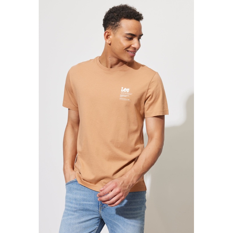 Lee Men's Light Brown Small Logo Tee T-Shirt_ Color: Fossil (a light brown earthy tone) Fit: Loose fit for relaxed comfort Material: 100% cotton Design: Small Lee logo on the front Tagline printed on the back Short sleeves, crew neck