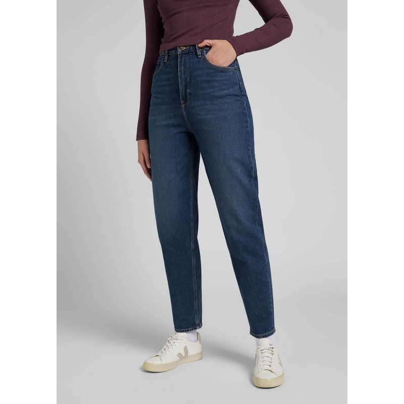 Lee Women's Dark Blue Ultra High Waist Jeans These stylish Lee jeans offer a flattering high-waisted fit with a contemporary tapered leg. The classic blue wash and relaxed silhouette make them a versatile staple, perfect for pairing with sneakers and a top