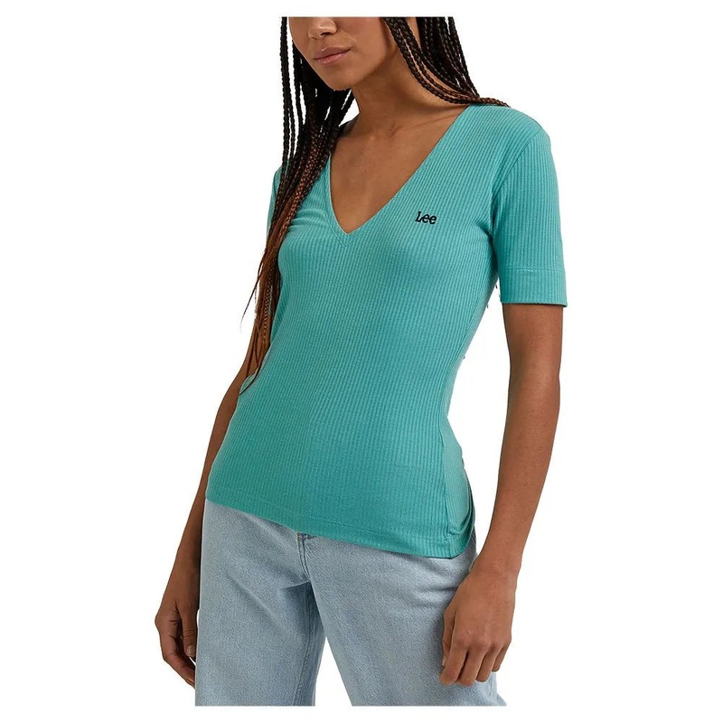 Lee Women's Green V-Neck Short Sleeve T-Shirt Constructed with a rib knit, this is a slim fit tee with a low, curved V-neck.The lightweight fabric is crafted in a clinging rib with plenty of stretch woven in to ensure it cleaves close to the skin.This love