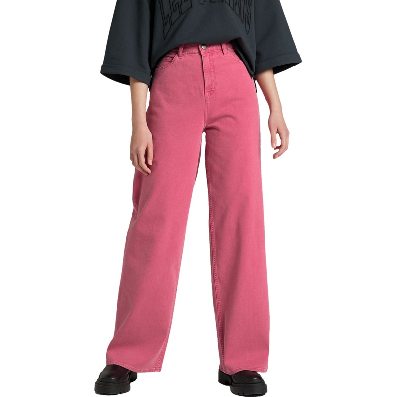 Lee Women's Pink Ultra High Waist Stella A Line Jeans Make a vibrant statement with these high-waisted, wide-leg Lee jeans in a playful pink hue. They feature classic five-pocket styling, a prominent Lee leather patch on the waistband, and the signature 'L