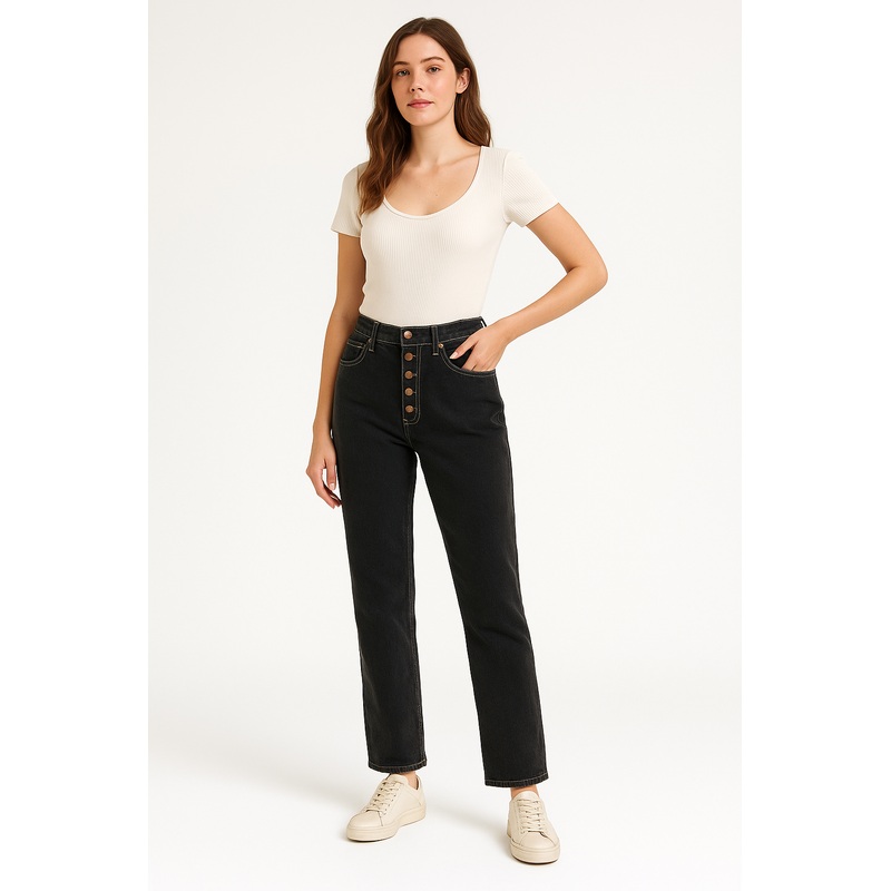 Levi's Women's Washed Black Ultra-High Rise Ribcage Straight Jean Elevate your denim game with these Levi's Ultra-High Rise Ribcage Straight Jeans in Black Stonewash. The jeans are designed with a button closure and a straight leg fit that is both comforta