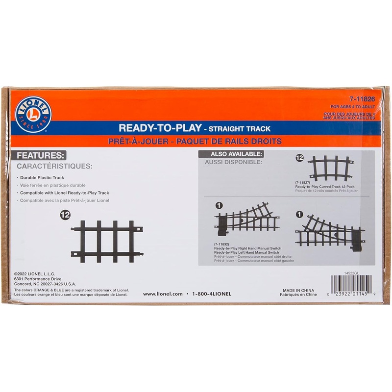 Lionel Ready-to-Play Straight Track Pack Toys. PRODUCT: Create a more complex track layout by expanding your Ready-to Play Track Layout with the Ready-to-Play 12 Piece Straight Black Plastic Track Pack by Lionel. Adding these tracks to your current layout