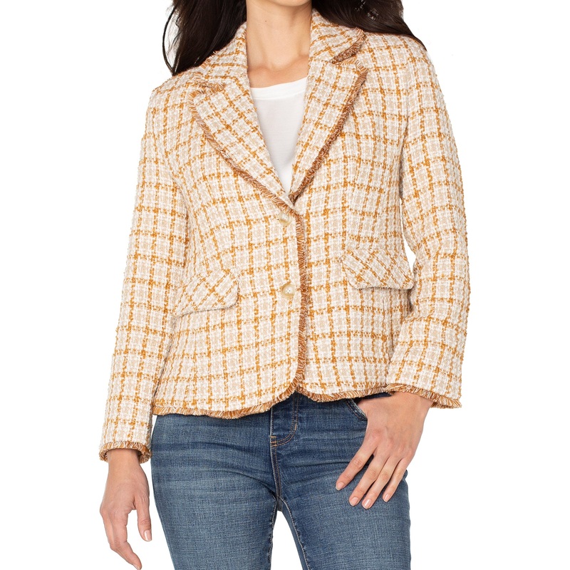 Rendered in a rich gold khaki plaid, this blazer blends timeless structure with unexpected edge. Frayed detailing softens the silhouette, offering a modern contrast to its tailored lines and heritage feel. Whether layered over a sleek knit or worn with rel