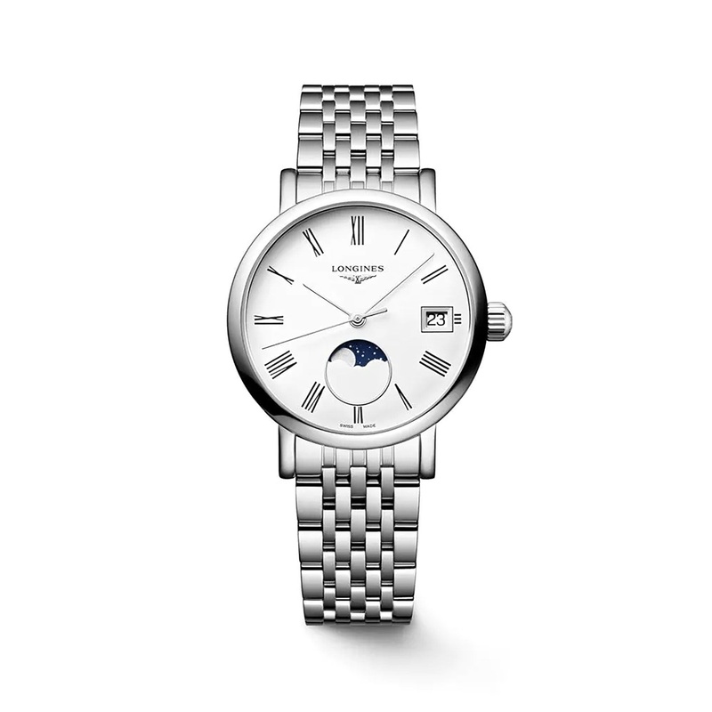 This watch features a 30mm stainless steel case, housing a striking white dial adorned with elegant Roman numeral hour markers and a moonphase aperture, adding a refined and unique touch. Powered by a reliable quartz movement, it ensures precise timekeeping. The watch is complemented by a polished stainless steel bracelet, providing both comfort and a sleek, cohesive look. With its exquisite craftsmanship and attention to detail, the L4.330.4.11.6 is an ideal choice for those who appreciate the artistry of fine watchmaking in the ELEGANT COLLECTION.