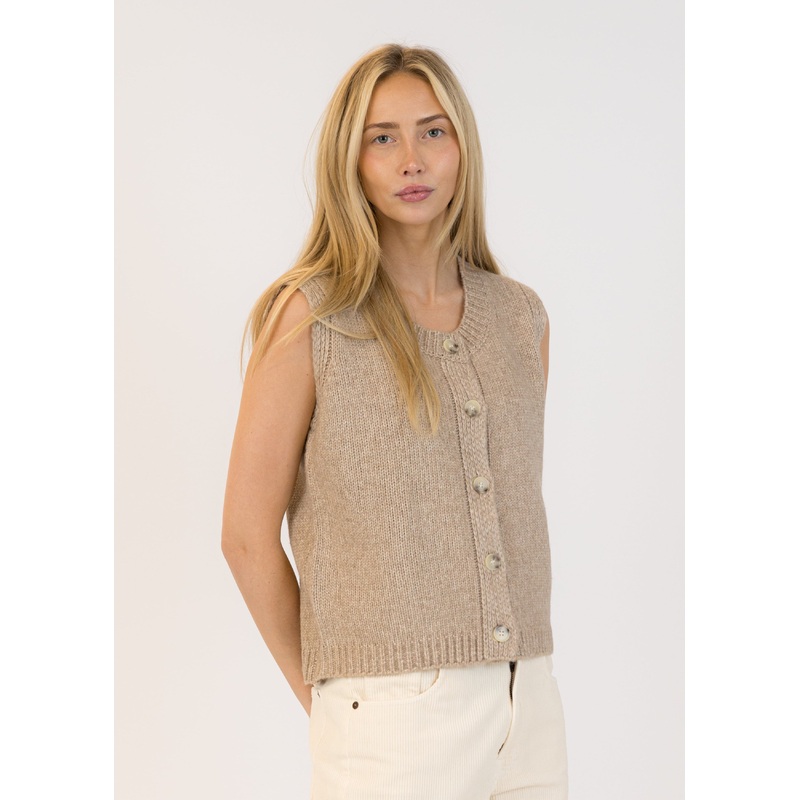Keep it versatile with this timeless sleeveless knit vest in a warm beige tone. Featuring a classic button-up front and a relaxed fit, this piece is perfect for layering over shirts or wearing solo for a minimalist, chic look. Ideal for year-round styling.